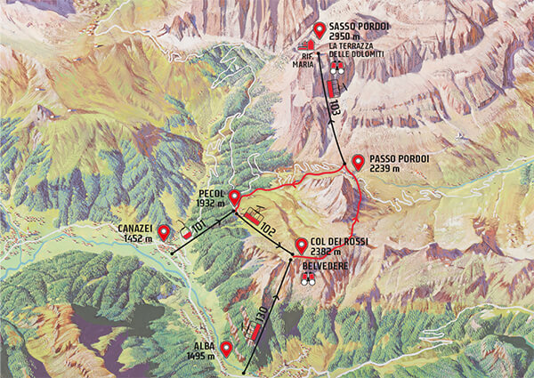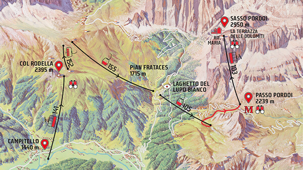 Nach der Ankunft am Panoramapunkt Belvedere-Col dei Rossi geht es zu Fuß zum Pordoijoch, auf dem Weg befindet sich die hübsche kleine Kirche „Regina della neve“ (Schneekönigin). Über eine asphaltierte Straße erreichen Sie leicht den Deutscher Soldatenfriedhof, mit Blick auf die venetischen Dolomiten und den Col di Lana. Auf dem Rückweg zum Pordoijoch sind das Fausto Coppi-Denkmal und das neue Museum über den Ersten Weltkrieg sehenswert.