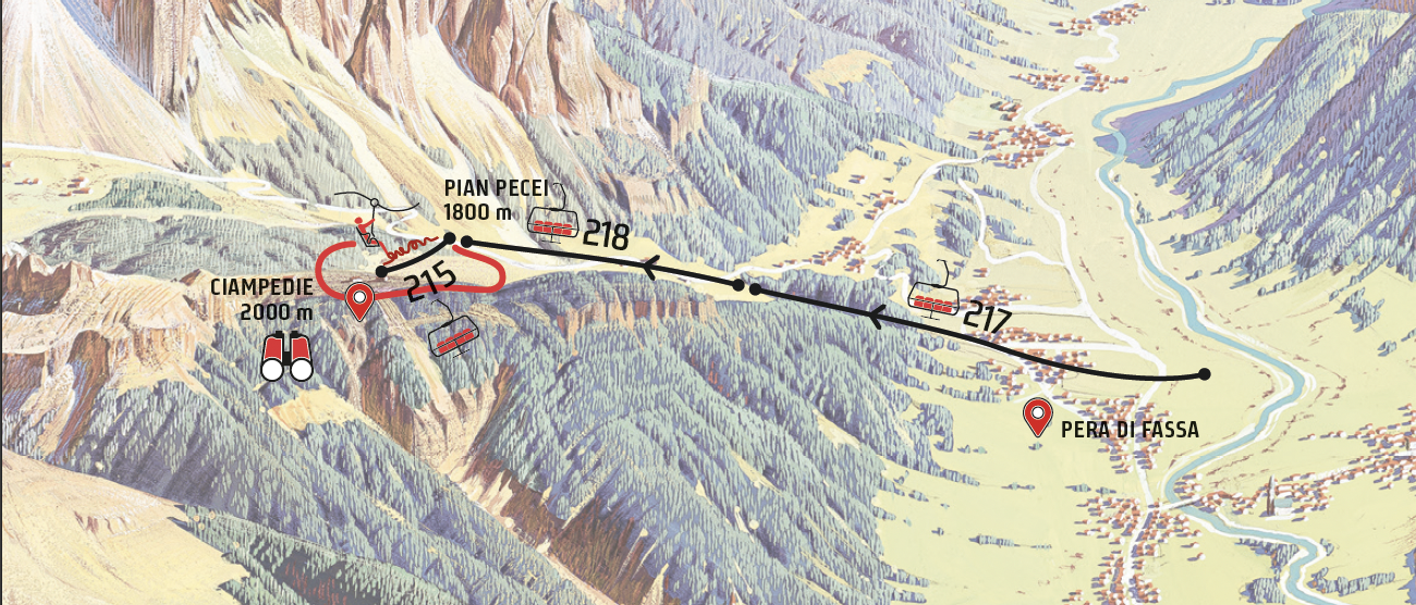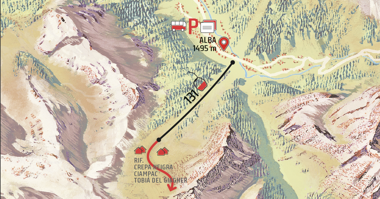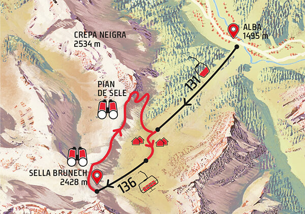 Sobald Sie mit der Seilbahn zum Ciampac gelangen, gehen Sie in Richtung des Spielplatzes auf der rechten Seite, wo der Weg nach Pian de Sele beginnt und entlang der Hänge des Crepa Neigra führt, einem Berg vulkanischen Ursprungs. Von dort gelangen Sie auf das Plateau, das einen atemberaubenden Blick auf das Val di Fassa und seine majestätischen Berge bietet. Der Rückweg erfolgt entlang derselben Strecke.