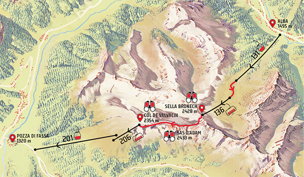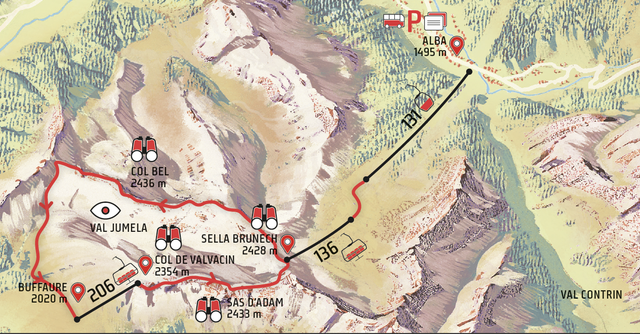 Umrundung des Fassatals, mit den Liftanlagen, zu Fuß und mit dem Fahrrad. Nach der Fahrt mit den Liftanlagen zum Col de Valvacin wandern Sie bis Sella Brunech, umgeben von dem atemberaubenden Ausblick auf die Dolomiten. Nach der Rückkehr vom Tal nach Alba können Sie entweder mit einem Mietfahrrad oder mit den öffentlichen Verkehrsmitteln nach Pozza zurückkehren. Mieträder müssen an der Kasse der Liftanlage in Pozza di Fassa reserviert werden. (Tel. +39 0462 763339)