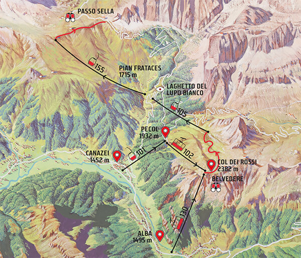 Über die 18 miteinander verbundenen, modernen und sicheren Liftanlagen erreichen Sie in wenigen Minuten große Höhen und genießen bereits während der Fahrt beeindruckende Ausblicke. Panorama Pass und Dolomiti Supersummer sind die Fahrkarten, die es ermöglichen, sämtliche Anlagen zu nutzen. Es ist auf jeden Fall möglich, Tickets für die ausschließliche Berg oder Talfahrt oder für die Hin und Rückfahrt zu erwerben.