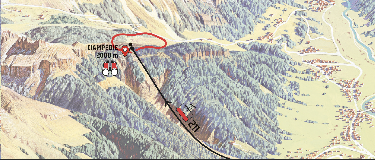 Mit den 3 Sesselliften hat man einen Blick von oben auf die Wälder. In Ciampedie kann man zwischen Tannen, Lärchen und Zirben vordringen, wo Eichhörnchen und andere Tiere leben. Mit leisem Auftreten kann man beobachten, wie sie reichhaltige Nahrungsvorräte sammeln, die sie in gut versteckten Vorratskammern für den Winter aufbewahren. Diese Exkursion ist für alle geeignet und bietet Einblicke in die Gewohnheiten und den Lebensraum dieser niedlichen kleinen Tiere. Rückkehr mit den Sesselliften oder ein aufregender Flug durch den Wald mit der FlyLine (separates Ticket erforderlich).