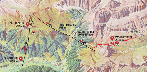In Pra' Martin (2.095 Meter Höhenlage) beginnt der Wanderweg “Vial de le feide“, der zur Rotwand führt. Von dort geht es bequem auf dem breiten Hirzelweg weiter bis zu dem Monument, das Theodor Christomannos gewidmet ist – dem drei Meter hohen Bronzeadler am Panoramapunkt mit Blick auf das Fassatal und das Eggental. Rückkehr zum Ciampedie über den Wanderweg „Alta via dei fassani“.