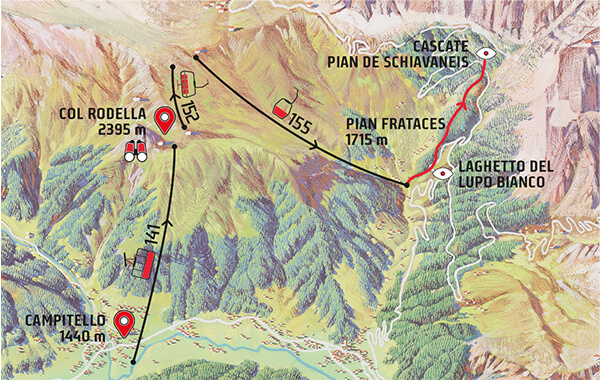 Aus geologischer Sicht hat der Col Rodella im Vergleich zum Profil der umliegenden Dolomiten sehr besondere Eigenschaften. Der Unterschied zwischen den hellen Kalkgesteinen der Dolomiten und dem dunklen Basaltgestein vulkanischen Ursprungs fällt sofort auf. Die Wanderung mit leichter Steigung von Pian Frataces führt zu den Wasserfällen in Pian de Schiavaneis, wo Sie auf den Felsen Murmeltiere auf Beobachtungsposten entdecken können.