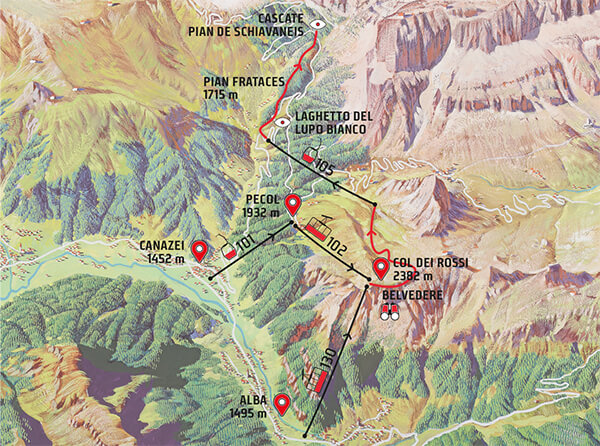 Vom Col dei Rossi geht es hinab in das Becken des Belvedere, mit atemberaubendem Ausblick auf die Langkofelgruppe und den eindrucksvollen Piz Ciavazes. Nach Ankunft am See Lupo Bianco (Ortschaft Pian Frataces) beginnt der Abstieg zu den Basalt-Wasserfällen. Diese sind nach den Säulen aus Basalt, einem Ergussgestein vulkanischen Ursprungs, benannt.