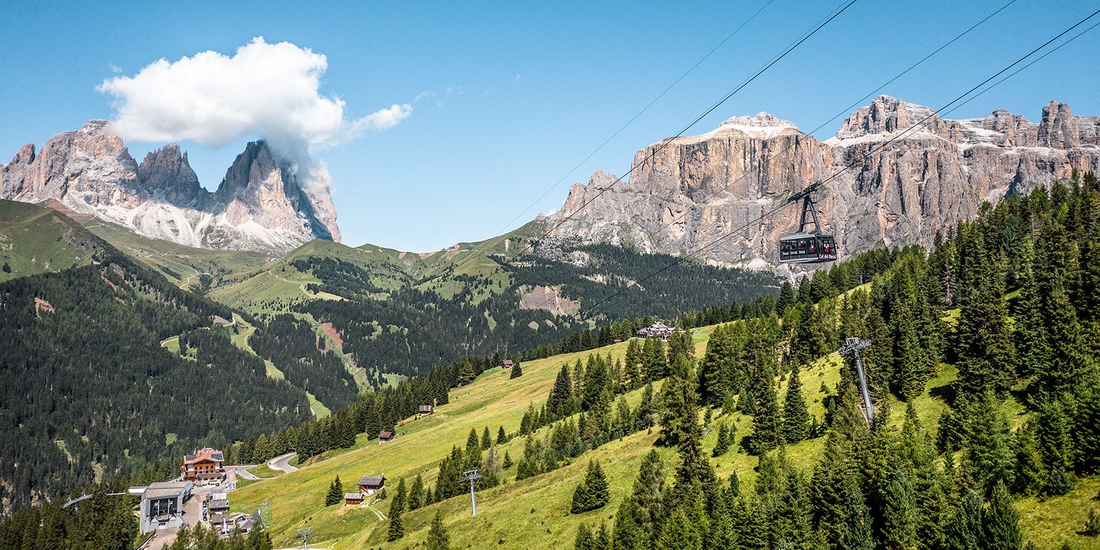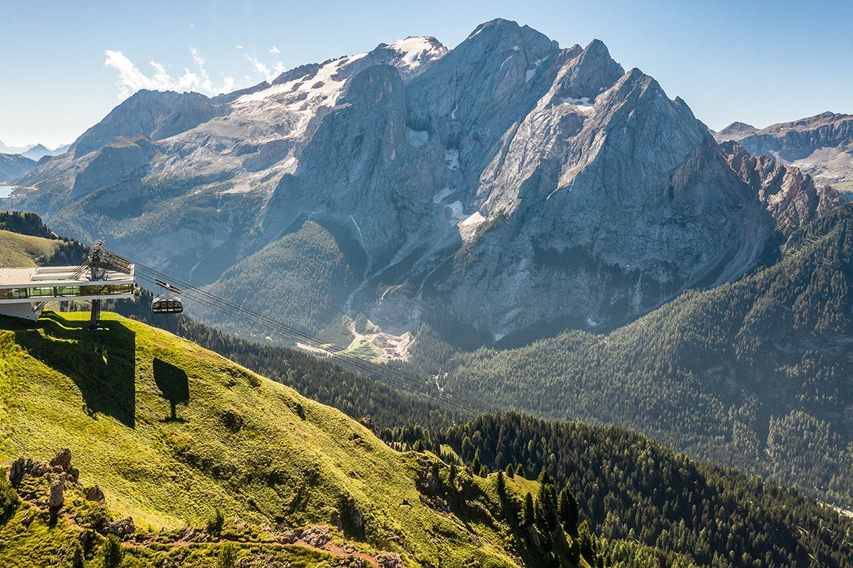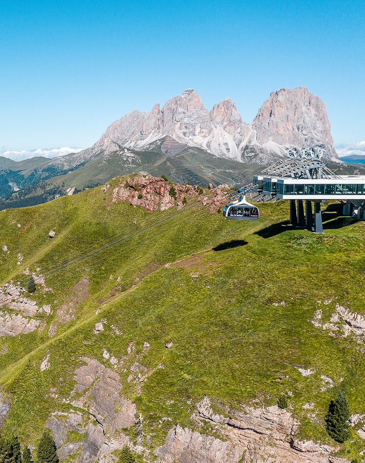 The trail leads to Passo Pordoi, where nature and landscapes merge into an evocative setting. After a short walk, you arrive at the Sass Pordoi cable car, which takes you to the Terrazza delle Dolomiti, at 2950 m, with unparalleled views.