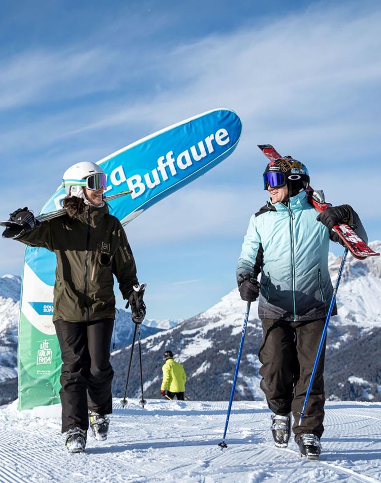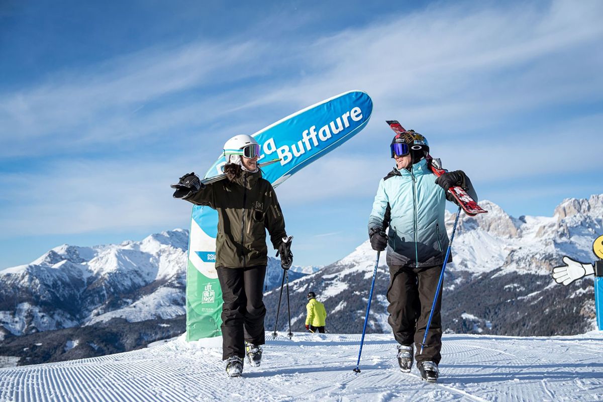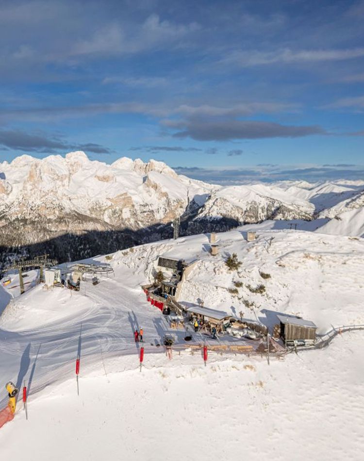 Buffaure is also hospitality: four mountain huts where you can enjoy an aperitif, a tasty snack with traditional Ladin dishes or a hot drink. You can choose between the sunny terrace of El Zedron at 2,354 metres, the panoramic tables at Baita Cuz (where you can also sleep in a splendid suite with sauna), the more traditional style of the Buffaure Mountain Hut (where you can also stay overnight) or the more modern style of the new Chalet la Bolp. At the bottom of the slopes, you will also find the refined Dolomites Geyser, a popular meeting place for après-ski in Pozza di Fassa.