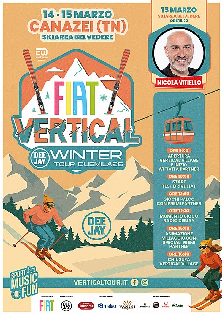 14 e 15 marzo a Canazei nella Ski Area Belvedere il Vertical Village, il "villaggio vacanze" itinerante sulla neve che anche quest'inverno fa tappa nelle località più belle del circuito alpino, accoglierà di nuovo grandi e piccini per una due giorni all'insegna del divertimento sulla neve. Tante le sorprese e i giochi a cui partecipare per vincere originali gadget. Il VERTICAL TOUR è un’avventura in tappe all’insegna dello sport e del divertimento. Balli, giochi, quiz, musica, dj set, gadget e sport: con il suo ricco programma di attività distribuite lungo l’arco della giornata il Vertical Village propone animazione gratuita per tutti. Tante le sorprese e i giochi a cui partecipare per vincere originali omaggi. Si conferma anche per questa edizione la presenza di Radio Deejay, il network ufficiale del tour che riempirà di energia le giornate sulle piste. Con dirette radiofoniche nazionali, musica e collegamenti dalla località, 5.200.000 ascoltatori da tutta Italia saranno sintonizzati con la Val di Fassa!